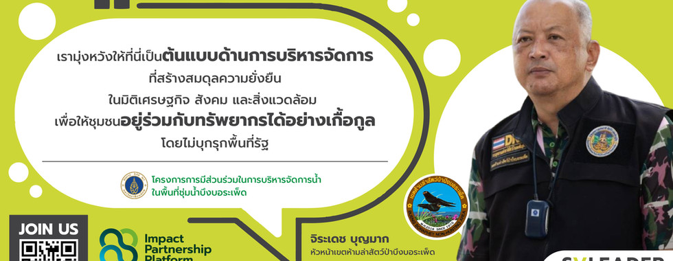 Project wants to expand cooperation. What to develop? Invite Impact Partnership. | 1. Climate Resilience:Expanding the "Alternating Wet and Dry (AWD) Model" to agricultural areas around the lake, inviting the private sector to join in creating market mechanisms and eco-friendly rice brands. 2. Technology:Develop the "SMART Bueng Boraphet" system to link APIs with databases of various agencies (e.g., the Royal Irrigation Department, the Department of Water Resources) 3. Sustainability (sustainability):Inviting local and educational sectors to join in promoting "New Generation Leaders" to participate in water user organizations to ensure continuity of the mechanism. |