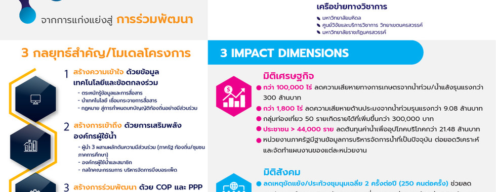 Factors contributing to project success | 1. Data (Building Shared Understanding):Creating a “Shared Understanding” is the most important key to reducing conflict. 2. Process (Power from the Roots):Success is driven by bottom-up drive and the creation of strong "Water User Organizations (WUOs)". 3. Leadership (mediator role):Mahidol University (Academic Sector) acts as a neutral "facilitator" helping to connect the government and the community. 4. Partnership (mutual benefits):Designing a process that makes all parties aware of "Shared Incentives" creates true integration. |